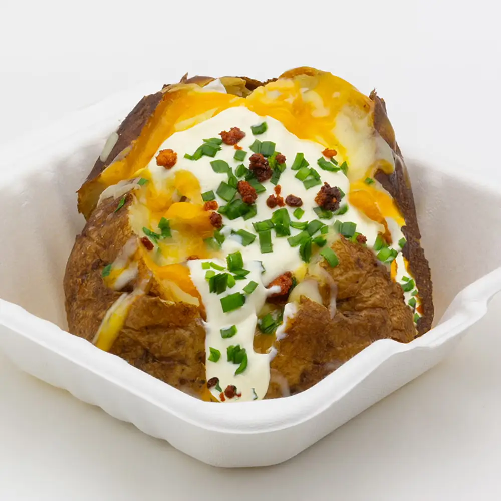 Jacket Potato with Cheese, Baked Potato, Sour Cream, Homemade Bacon Bits and Chives